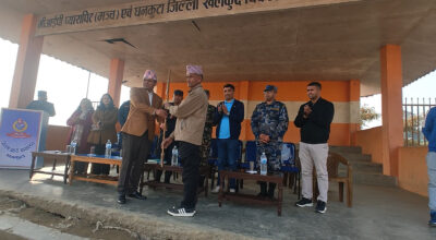 धनकुटा, १८ माघ —धनकुटाको साँगुरीगढी गाउँपालिका–७ स्थित गोलखाडी माध्यमिक विद्यालयले पालिका स्तरीय राष्ट्रपति रनिङ शिल्ड प्रतियोगितामा स्वर्ण पदक विजेता विद्यार्थी खेलाडीलाई सम्मान गरेको छ ।विद्यालयले माघ १५ र १६ गते सम्पन्न पालिका स्तरीय राष्ट्रपति रनिङ शिल्ड प्रतियोगितामा विभिन्न विधामा स्वर्ण पदक प्राप्त गर्ने तथा प्रतियोगितामा सहभागी विद्यार्थी खेलाडीलाई एक कार्यक्रमको आयोजना गरी सम्मान गरेको बताएको…