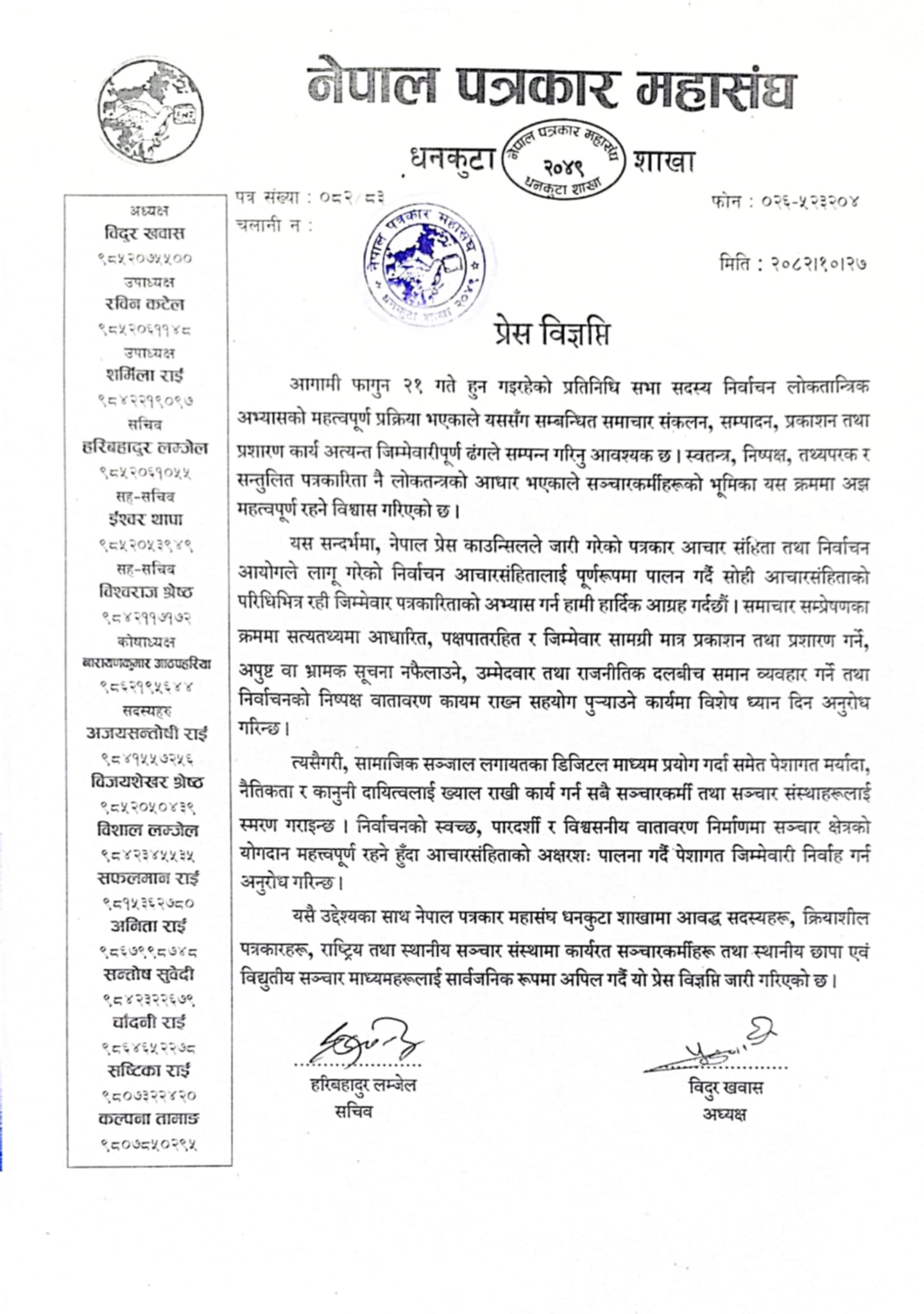 धनकुटा माघ,२४ । नेकपा (एमाले) धनकुटा जिल्ला समितिले आसन्न प्रतिनिधिसभा निर्वाचनलाई लक्षित गर्दै भइरहेको भ्रामक प्रचार, आचारसंहिता उल्लङ्घन र गैरकानुनी गतिविधिप्रति गम्भीर ध्यानाकर्षण भएको जनाएको छ ।जिल्ला समितिद्वारा जारी प्रेस विज्ञप्तिमा भनिएको छ निर्वाचनको मिति[ ... ]