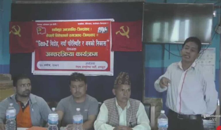 १० असोज , धनकुटा । नेपाल कम्युनिस्ट पार्टीका केन्द्रिय सदस्य तथा केन्द्रिय स्कुल विभाग सदस्य तिर्थ सिले पुजीवादको विकल्प पुजीवाद नभई नेपाली विषेशताको समाजवादमा जानुपर्ने आवश्यता रहेको बताएका छन । नेपाल कम्युनिस्ट पार्टी, धनकुटाले शुक्रबार जेन्जी विद्रोह, नयाँ परिस्थिती र अबको निकास” शीर्षकमा गरेको अन्तरक्रियात्मक कार्यक्रममा बोल्दै उनले यस्तो बताएका हुन । अब लोकतन्त्रको विकल्प लोकतन्त्र नै हो भन्ने कुरा अन्य राजनितिक दलले पनि छाडी अहिलेको युगले चाहेको व्यवस्थालाई अगाल्दैै अगाडी बढनुको विकल्प नरहेको उनको भनाई छ । कार्यक्रममा उनले नेपालको विशेषता अनुसारको समाजवाद, एकीकृत जनक्रान्ति र नयाँ पुस्ताको भूमिकाबारे आफ्ना धारणा राखेका थिए। त्यस्तै कार्यक्रममा बोल्दै नेपाली काग्रेसका सचिव विजय सन्तोषी राई, नेकपा एमालेका सचिव परशुराम नेपाल ,नेकपा माओवादी केन्द्रका ओमप्रकास निरौला जेनजीका लिडर सिरज जाेशी लगायतले अब नया पुस्ताले चाहे अनुसारको काम गर्दै जानुपर्ने बताए । कार्यक्रममा विभिन्न संघसस्थाका प्रमुख एवं प्रतिनिधिहरुले अहिलेको बदलीदो परिस्थतीको विषयमा आफना धाराण राखेका थिए । धनकुटामा भएको सो कार्यक्रममार्फत पार्टीले हालको सामाजिक–राजनीतिक अवस्थाबारे युवापुस्तासँग प्रत्यक्ष संवाद गर्दै नयाँ पुस्ताको विचार र चुनौतीबारे छलफल गरेको हो। कार्यक्रममा “मार्क्सवाद, लेनिनवाद, माओवाद”को सन्दर्भसहित नेपाली समाजवादलाई बलियो बनाउने मार्ग र जेनजी पुस्ताको योगदानबारे बहस गरिएको आयोजकले जानकारी दिएको छ । पार्टीका स्थानीय नेतृत्वले युवापुस्ताको सक्रिय सहभागिता बिना सामाजिक रूपान्तरण सम्भव नहुने बताउँदै यस्ता कार्यक्रमले नयाँ विचार आदान–प्रदानमा टेवा पुग्ने विश्वास व्यक्त गरेका छन्।