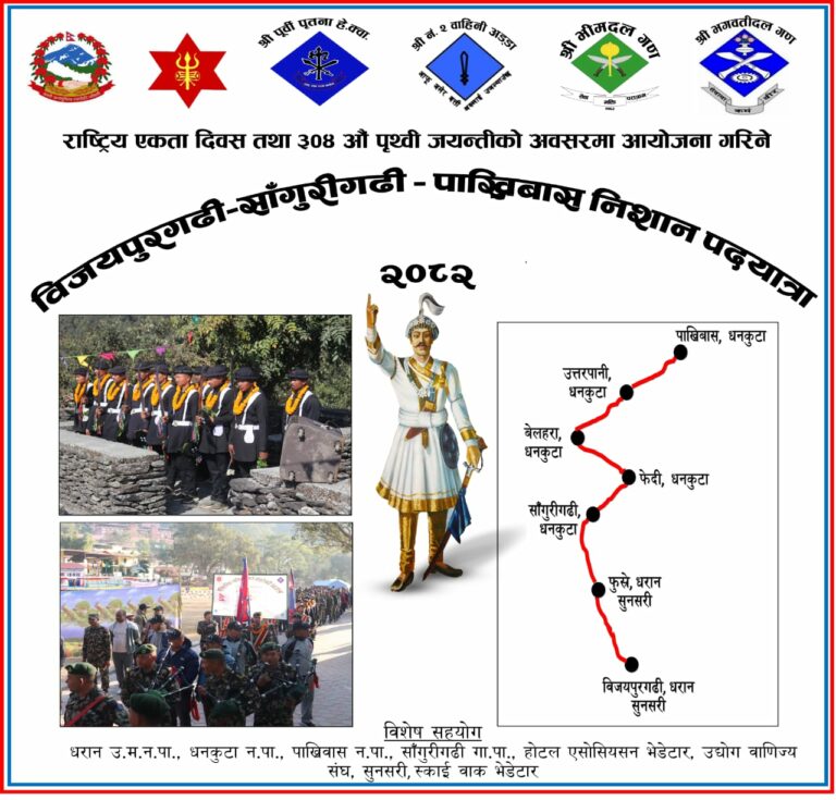 पुस ९ धनकुटा । नेपाली सेनाले ३०४ औँ पृथ्वी जयन्ती तथा राष्ट्रिय एकता दिवस २०८२ को अवसरमा सुनसरी र धनकुटा जिल्लाका ऐतिहासिक तथा सांस्कृतिक सम्पदाको संरक्षण र प्रवर्द्धन गर्ने उद्देश्यले विशेष कार्यक्रम आयोजना गर्ने भएको छ। नेपाली सेनाको पूर्वी पृतना हे.क्वा. तथा नं २ बाहिनी अड्डाको संयोजनमा, धनकुटास्थित भीमदल गण र सुनसरीस्थित भगवतीदल गणको पहलमा कार्यक्रम आयोजना हुन लागेको सेनाले जनाएको छ । उक्त कार्यक्रम धरान उपमहानगरपालिका, धनकुटा नगरपालिका, साँगुरीगढी गाउँपालिका र पाख्रीबास नगरपालिकाको विशेष सहयोगमा सञ्चालन गरिने आयेजकले जनाइएको छ।