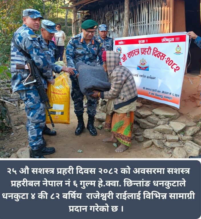 धनकुटा नगरपालिका ४ की ८२ वर्षीया विपन्न तथा एकल महिला राजेश्वरी आठपहरियालाई सशस्त्र प्रहरीले खाद्यान्न तथा लत्ताकपडा वितरण गरेको हो। गुल्मपति प्रेमप्रसाद सिग्देलको नेतृत्वको टोलीले ती महिलाको घरमै पुगेर सहयोग सामग्री हस्तान्तरण गरेको थियो । स्थापना दिवसको अवसरमा सामाजिक उत्तरदायित्वअन्तर्गत मानवीय सेवामा जोड दिँदै असहाय तथा विपन्न वर्गलाई सहयोग गरिएको गुल्म पति सिग्देलले जनाए । यस्ता सहयोगात्मक गतिविधिले समुदायसँग सशस्त्र प्रहरीको सम्बन्ध थप सुदृढ हुने विश्वास व्यक्त गरे । कार्यक्रममा गुल्मपति प्रेमप्रसाद सिग्देल, नेपाल पत्रकार महासंघ धनकुटाका अध्यक्ष विदुर खवास, पत्रकार विनोद घिमिरे लगायतको उपस्थिती रहेको थियो ।