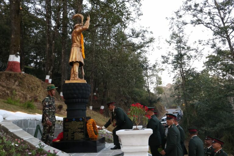 धनकुटा, २८ पुस । नेपाली सेनाले धनकुटाको हिलेस्थित २ नम्बर बाहिनी अड्डाको प्रवेशद्वारमा राष्ट्रनिर्माता पृथ्वीनारायण शाहको पूर्णकदको शालिक स्थापना गरेको छ। पृथ्वीजयन्ती तथा राष्ट्रिय एकता दिवसको अवसर पारेर आइतबार शालिकको औपचारिक अनावरण गरिएको हो।