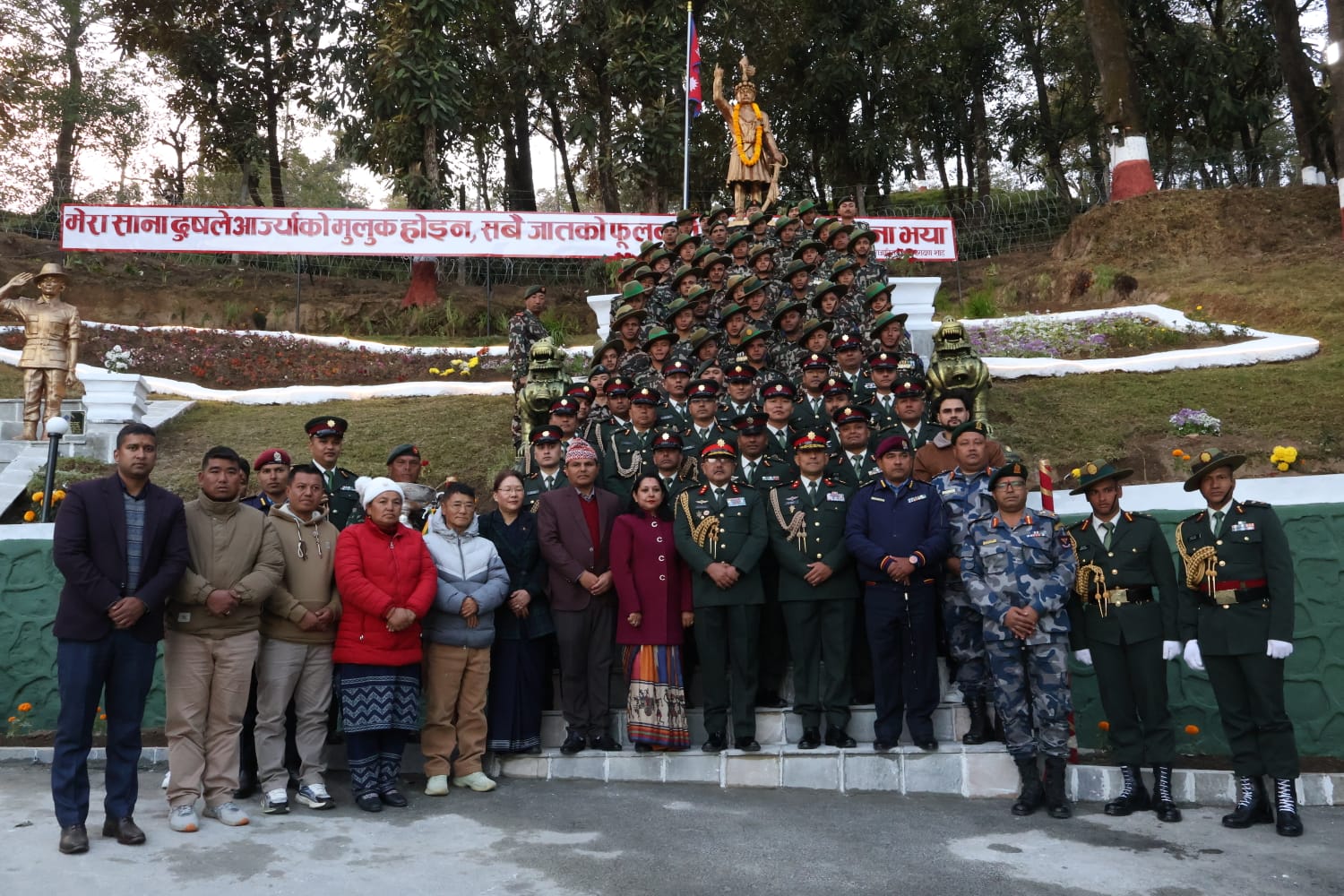 धनकुटा, २८ पुस । नेपाली सेनाले धनकुटाको हिलेस्थित २ नम्बर बाहिनी अड्डाको प्रवेशद्वारमा राष्ट्रनिर्माता पृथ्वीनारायण शाहको पूर्णकदको शालिक स्थापना गरेको छ। पृथ्वीजयन्ती तथा राष्ट्रिय एकता दिवसको अवसर पारेर आइतबार शालिकको औपचारिक अनावरण गरिएको हो।
