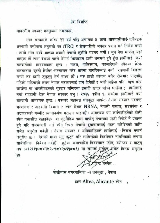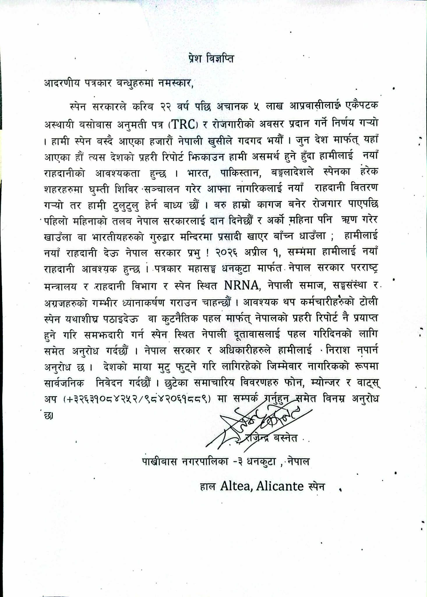 स्पेनमा रहेका नेपाली आप्रवासीहरूले २०२६ अप्रिल १ भित्र नयाँ राहदानी आवश्यक पर्ने उल्लेख गर्दै विज्ञप्ती मार्फत नेपाल सरकार, परराष्ट्र मन्त्रालय, राहदानी विभाग, स्पेनस्थित, नेपाली समाज, संघसंस्था तथा अग्रजहरूको गम्भीर ध्यानाकर्षण गराएका छन्।