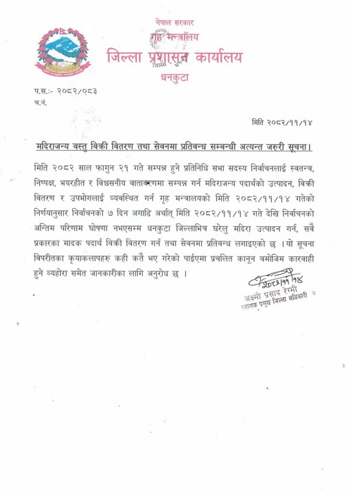 - अन्तिम मत परिणाम घोषणा नभएसम्म प्रतिबन्ध कायम रहने निर्णय जिल्ला प्रशासन कार्यालय धनकुटाको।