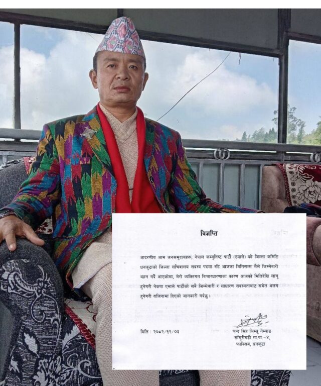 ४ चैत्र,धनकुटा । नेपाल कम्युनिष्ट पार्टी (एमाले) धनकुटा जिल्ला कमिटीका सचिवालय सदस्य चन्द्रसिंह नेम्वाङले पार्टीका सबै जिम्मेवारी र साधारण सदस्यताबाट राजीनामा दिएका छन्।