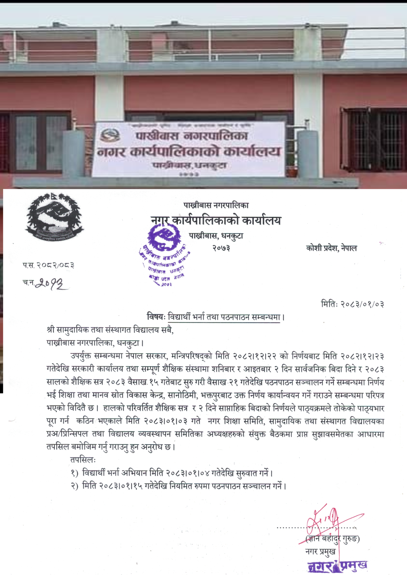 ४ बैशाख, धनकुटा । पाख्रीबास नगरपालिकाका प्रमुख ज्ञान बहादुर गुरुङ ले विद्यालय सञ्चालनबारे नयाँ निर्णय गरेका छन्। संघीय सरकारको पछिल्लो निर्णयका कारण विद्यालय शिक्षामा अन्योल बढेपछि स्थानीय तहले आफ्नै तहबाट स्पष्ट मार्गनिर्देशन दिएको हो।